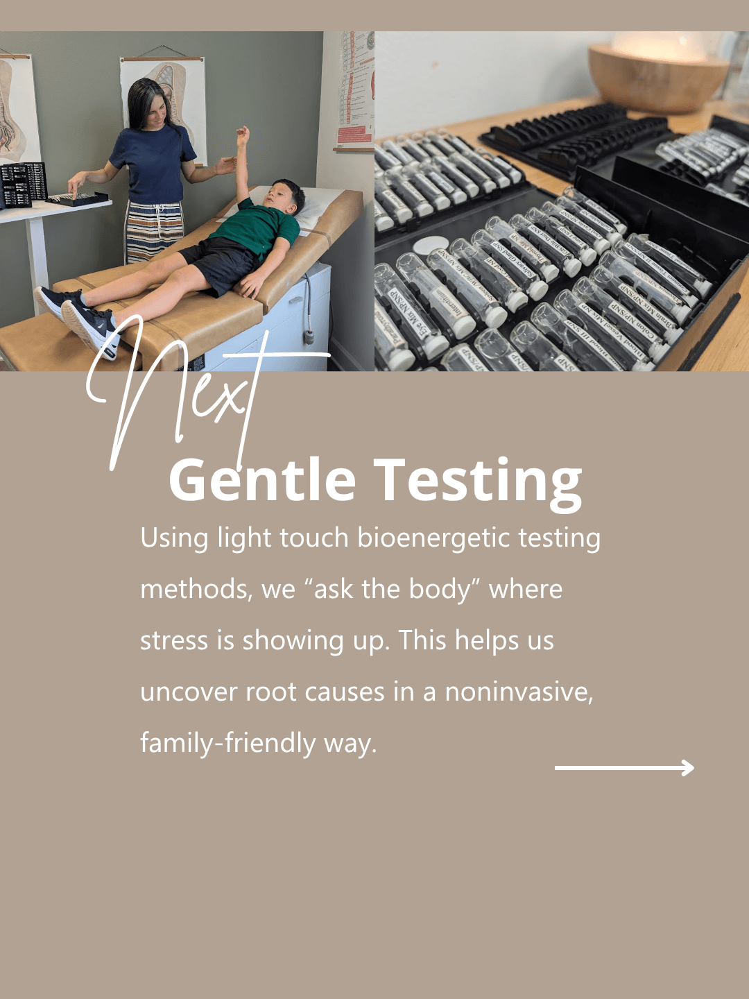 Next, we move into Muscle Response Testing—a gentle, non-invasive technique also known as Nutrition Response Testing, Applied Kinesiology, or Morphogenic Field Technique. This hands-on process uses your body’s natural reflexes to identify stressors and assess which solutions are most supportive, such as vitamins, herbs, homeopathics, food categories, or lifestyle changes.
