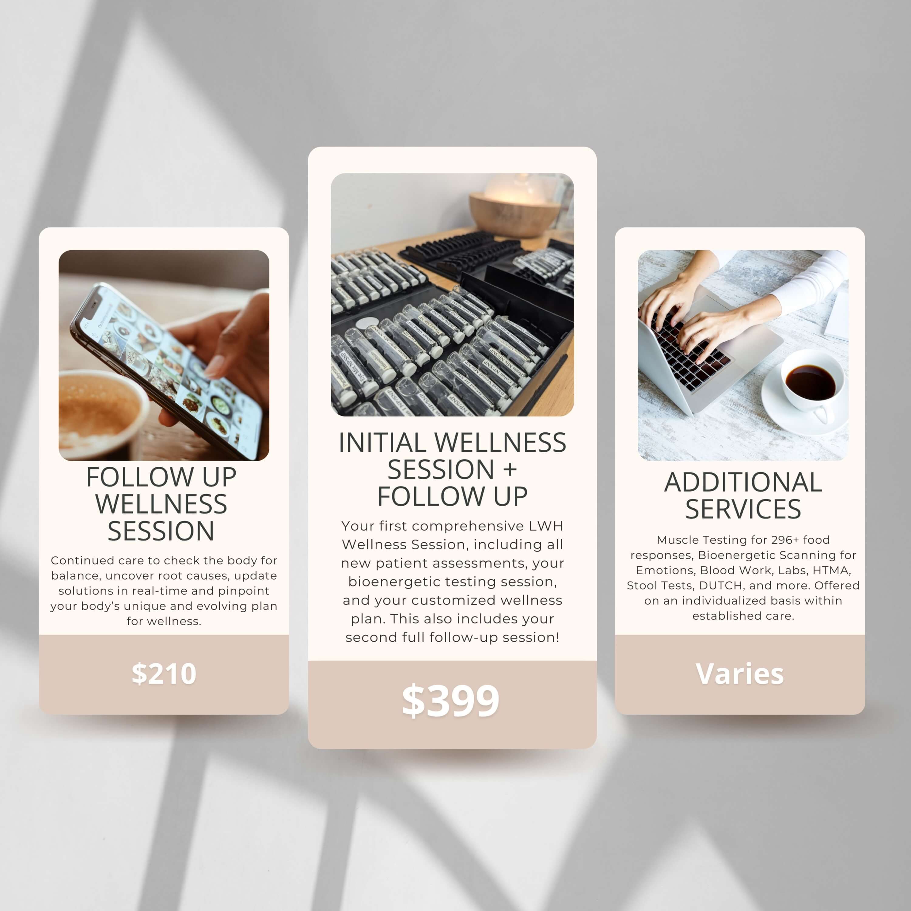 If needed and desired, we can incorporate functional labs and additional services, including Nutrition Coaching, Food Testing, DUTCH Testing, GI Mapping, etc. as we move along in your wellness story. These are only available once care is established.